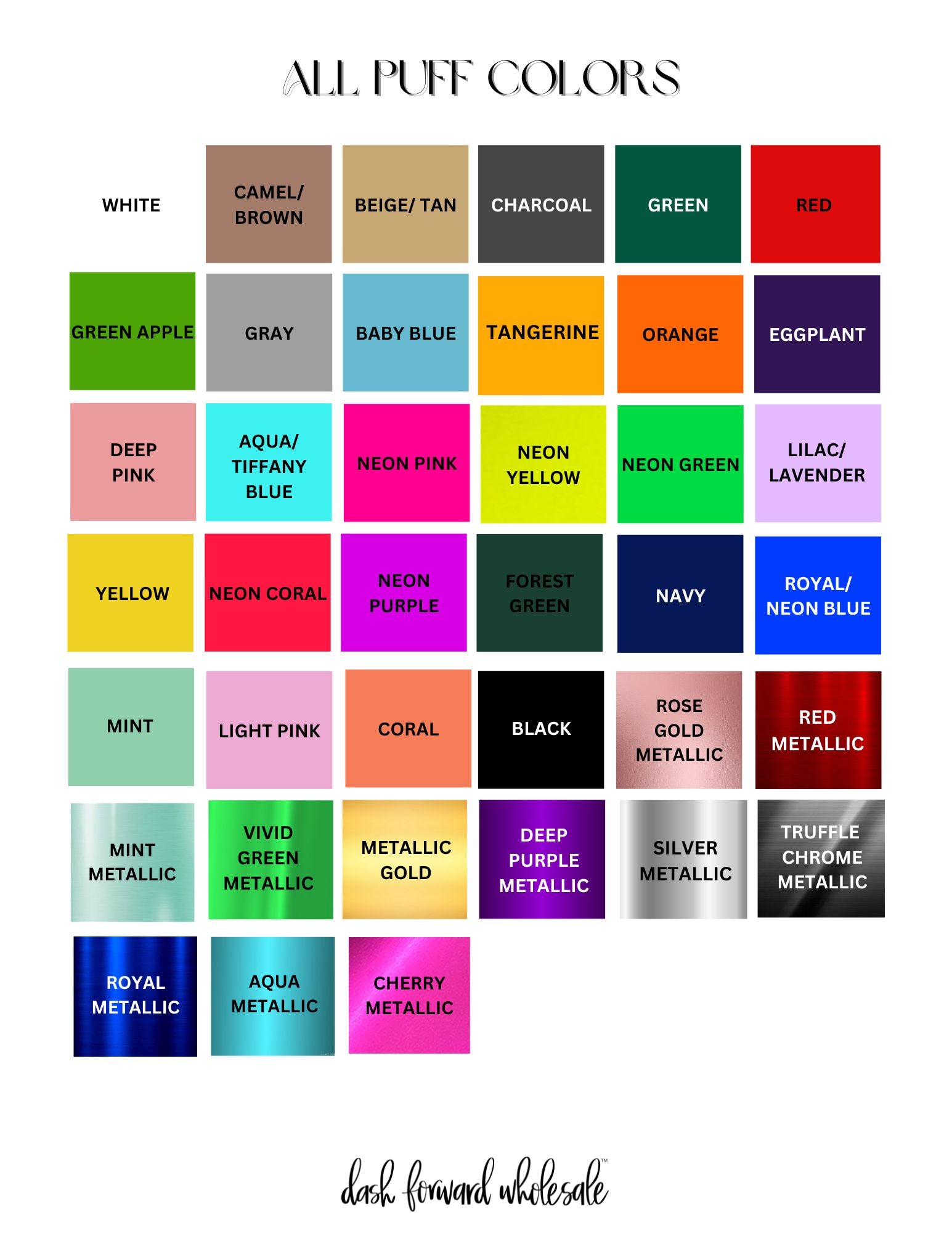 Color Pictured: Crimson with Silver metallic Puff and Pepper with royal metallic puff